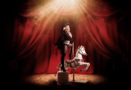 Die wunderschönen, opulenten Pferde auf alten Karussells haben mich schon immer fasziniert, ein solches zu besitzen ist wohl Traum vieler Mädchen. Ich habe mir diesen Traum erfüllt und mein Karussellpferd Prestige für meine Burlesqueshow anfertigen lassen. Geheimnisvoll, bezaubernd, stark, sanft…. mit Zuckerbrot und Peitsche. Stilsicher in glitzerndem Frack, antikem Zylinder, ganz viel Strass und schmeichelnden Federn biete ich Ihnen diese außergewöhnliche Show dar und setze mich gekonnt erotisch in Szene.