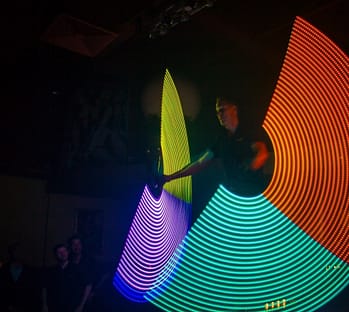Die Absolventin der Staatlichen Artistenschule Berlin begeistert das Publikum sowohl mit ihrer Jonglage im Scheinwerferlicht als auch im Dunklen mit ihren LED-Poi.